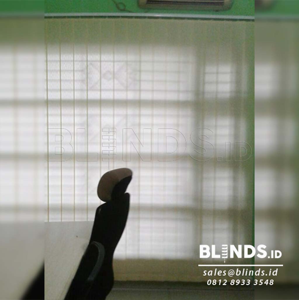 Vertical blinds bahan dimout merupakan jenis tirai dengan bentuk bilah-bilah vertical yang terbuat dari jenis bahan dimout yang mana jenis bahan ini cahaya atau sinar matahari tetap dapat masuk kedalam ruangan namun tetap dapat menjaga privasi ruangan.